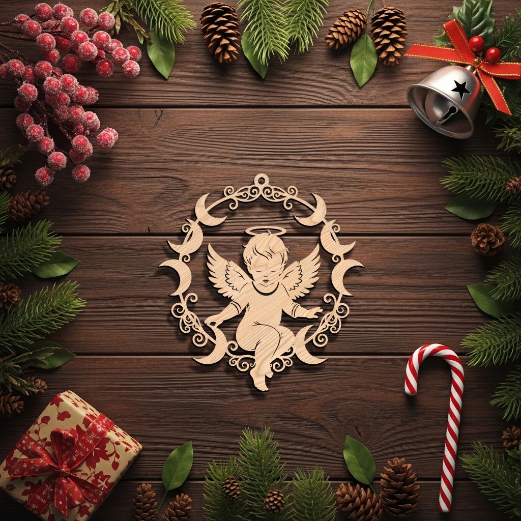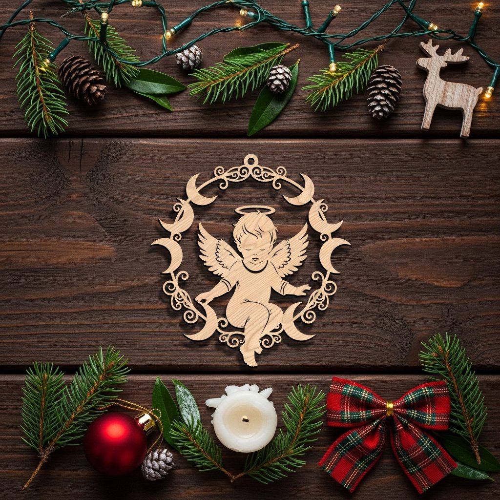 Angel Ornament Christmas Laser File, Crescent Wreath Angel Silhouette Decor Download