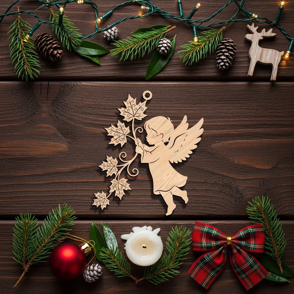 Angel Ornament Laser Design, Christmas Angel with Leafy Branch, Holiday Decor
