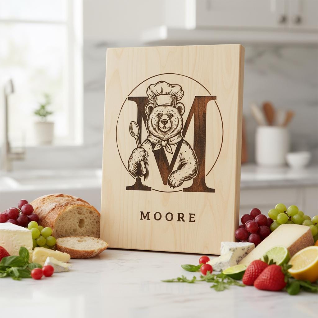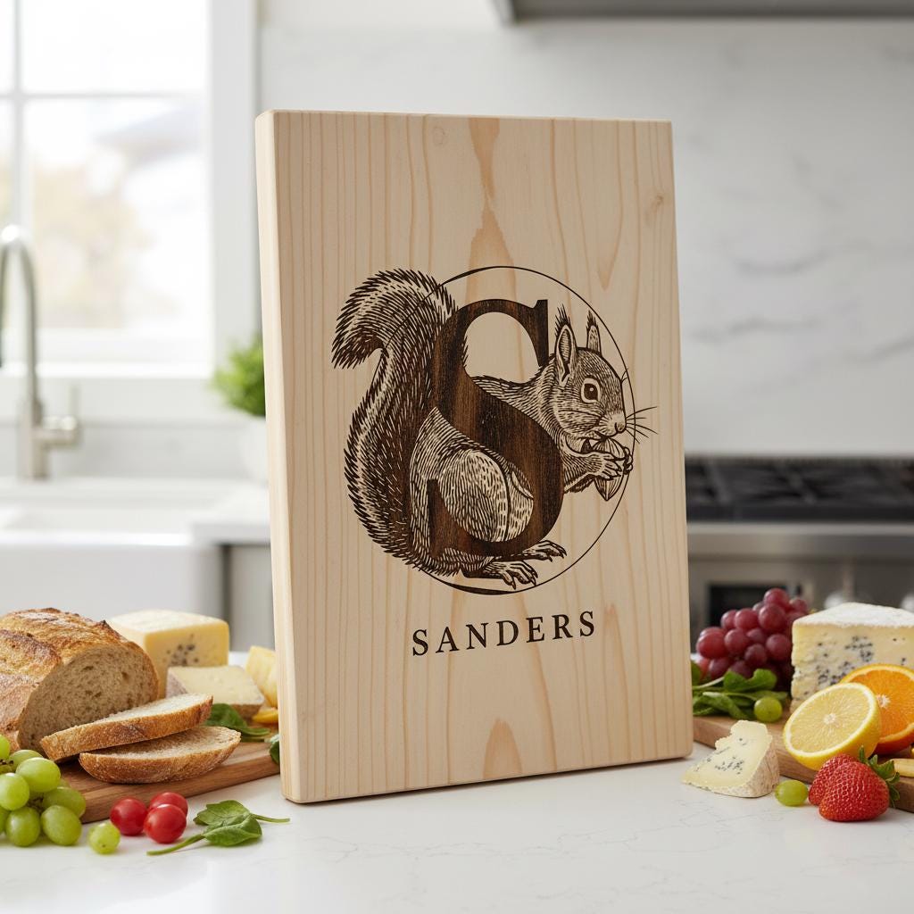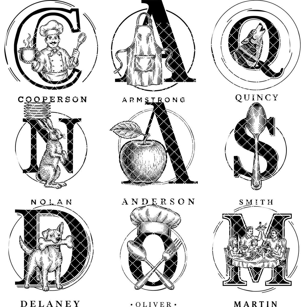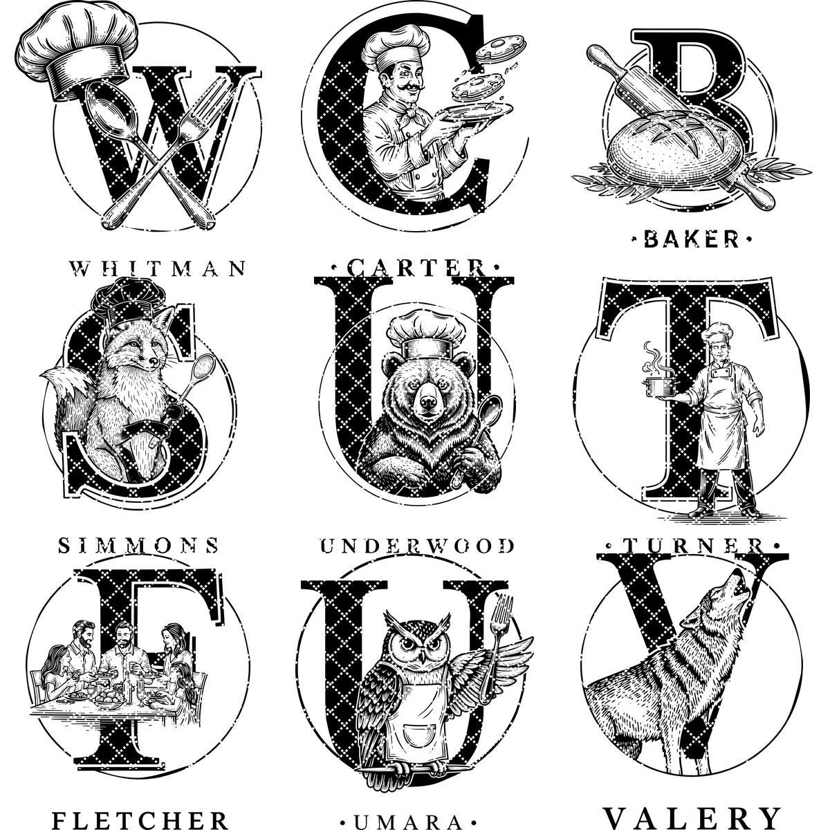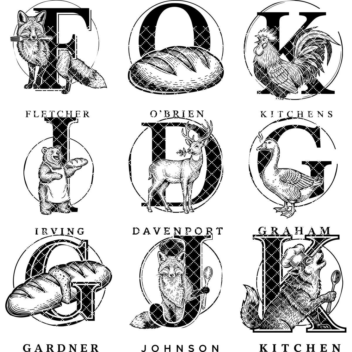Elevate your kitchen creations with the Chef Animal Monogram collection, featuring 52 unique vintage designs perfect for personalizing charcuterie boards and more. Each design elegantly combines family names with charming animal motifs, adding warmth and style to every project.