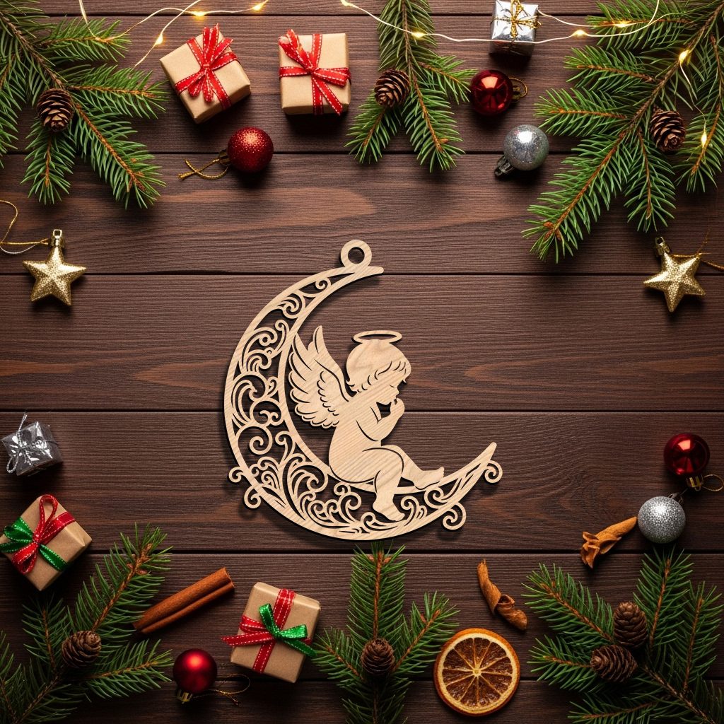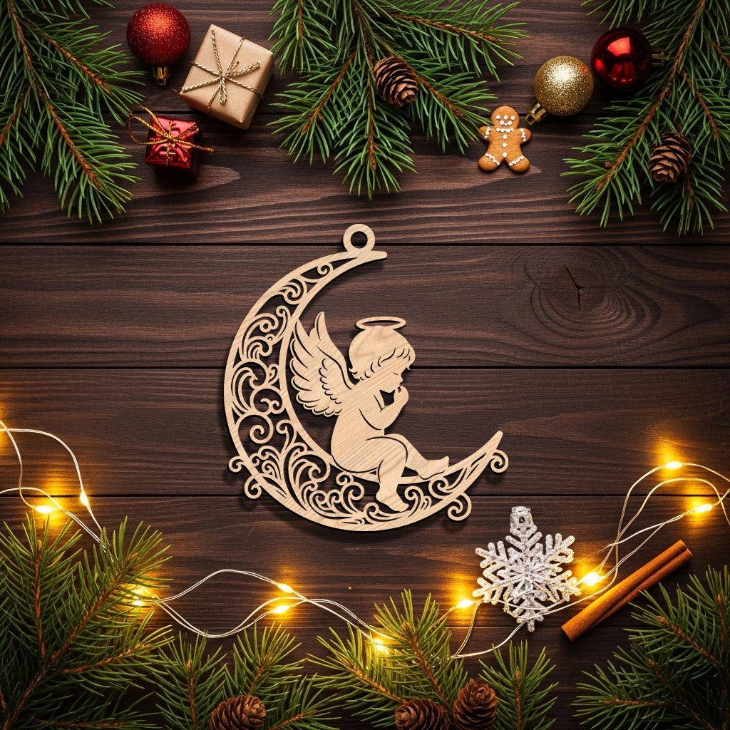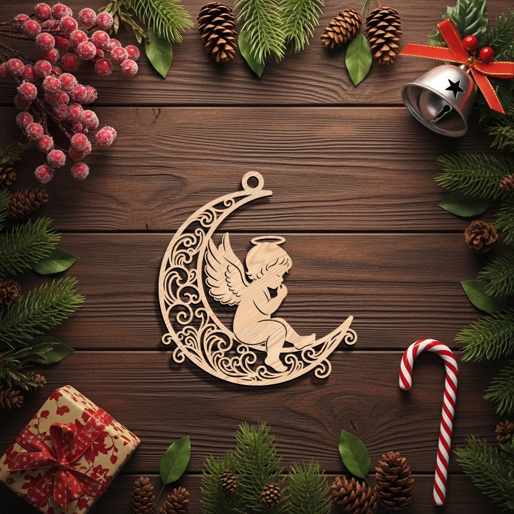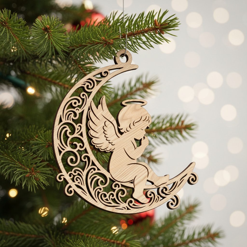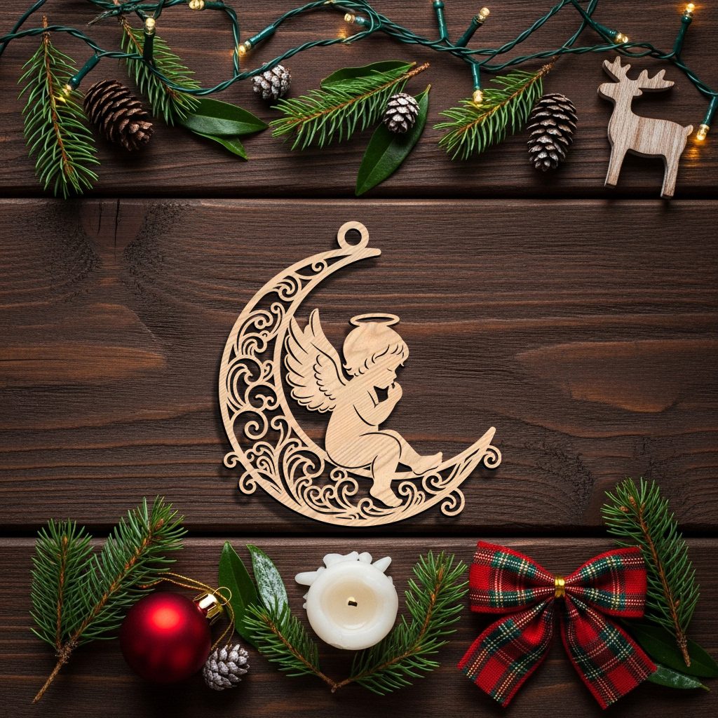 Christmas Angel Ornament Digital File, Filigree Moon Design, CNC Laser Decor