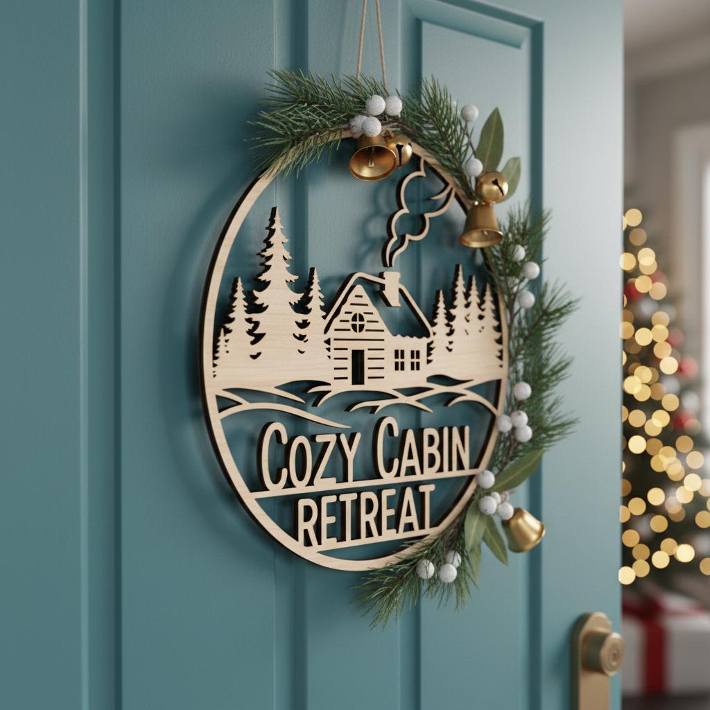 Christmas Cabin Door Hanger, Round Winter Scene Wood Sign, Holiday Home Decor