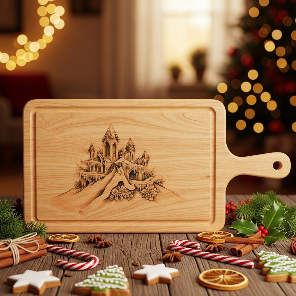 Transform your holiday gatherings with our Christmas Laser Engraving File, designed to create a stunning charcuterie board featuring the enchanting Crystal Palace on a snowy hill. This festive design instantly elevates your kitchen decor and delights guests with its seasonal charm.