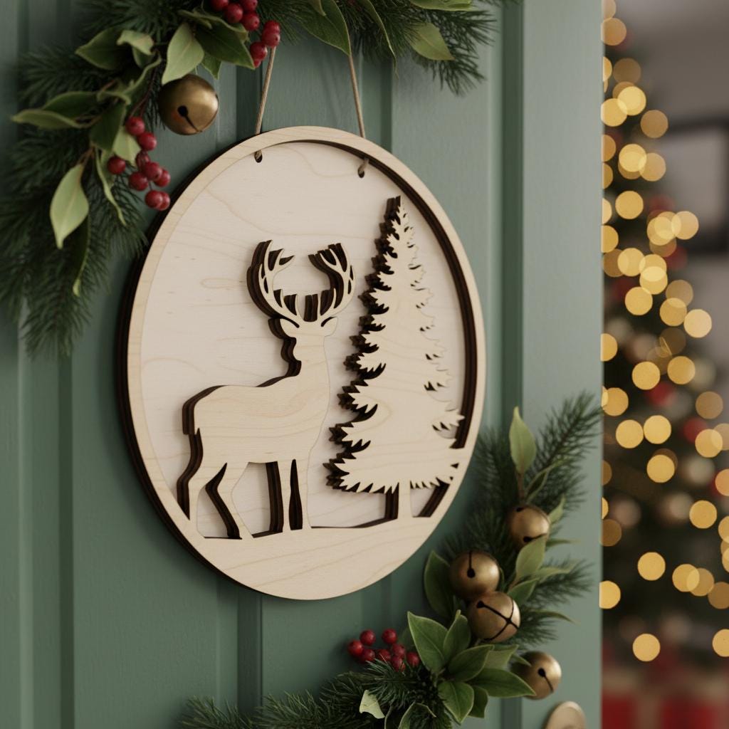 Christmas Reindeer Door Hanger, Round Deer and Tree Wood Sign, Holiday Decor