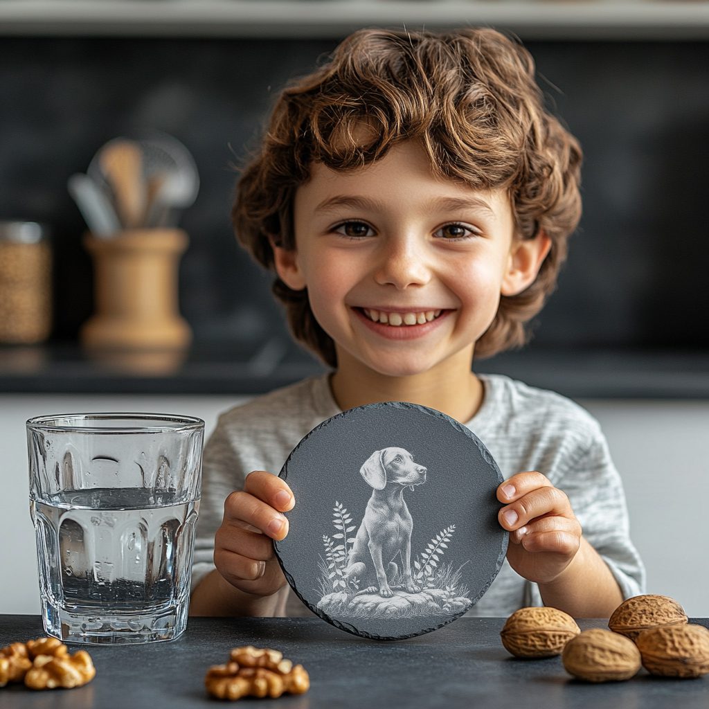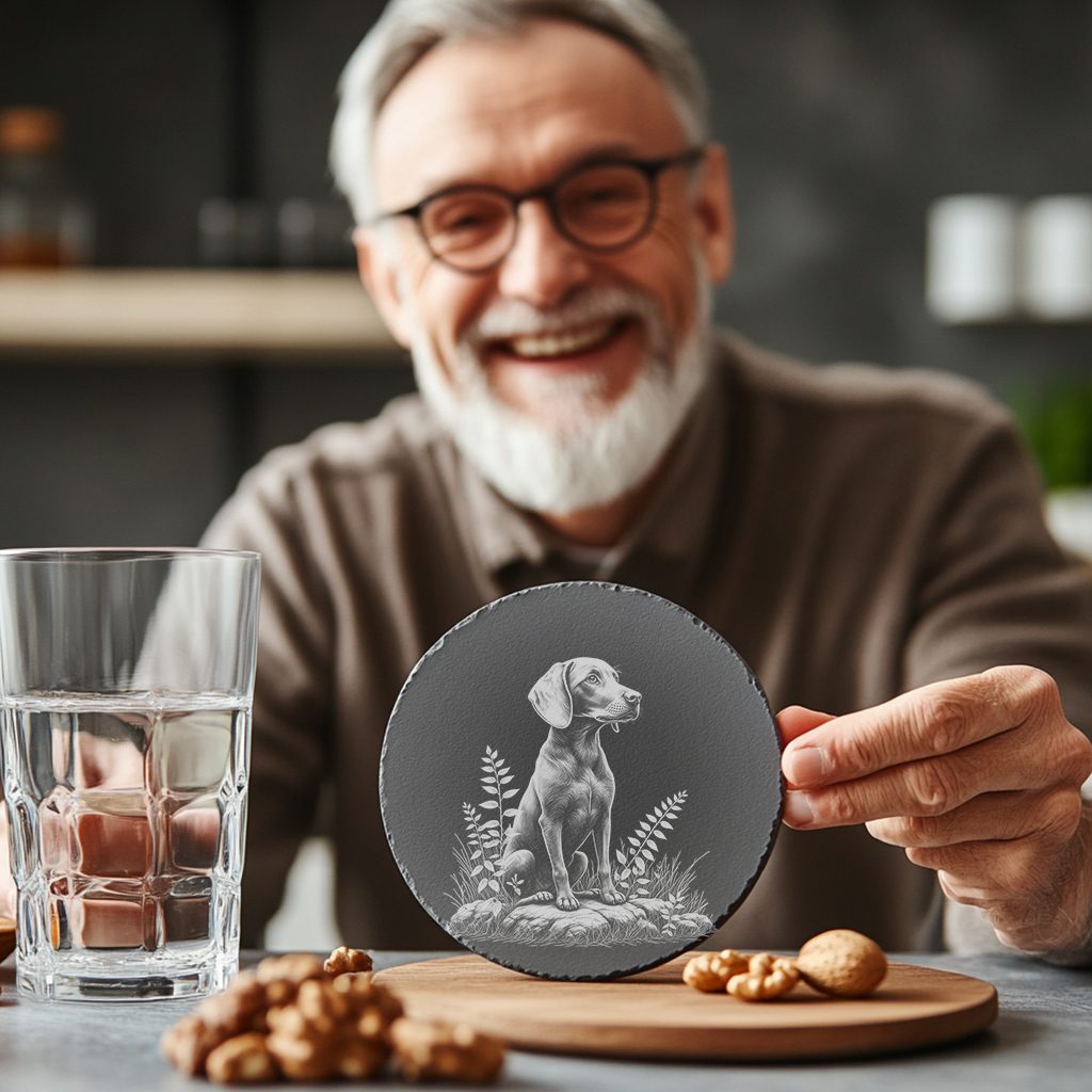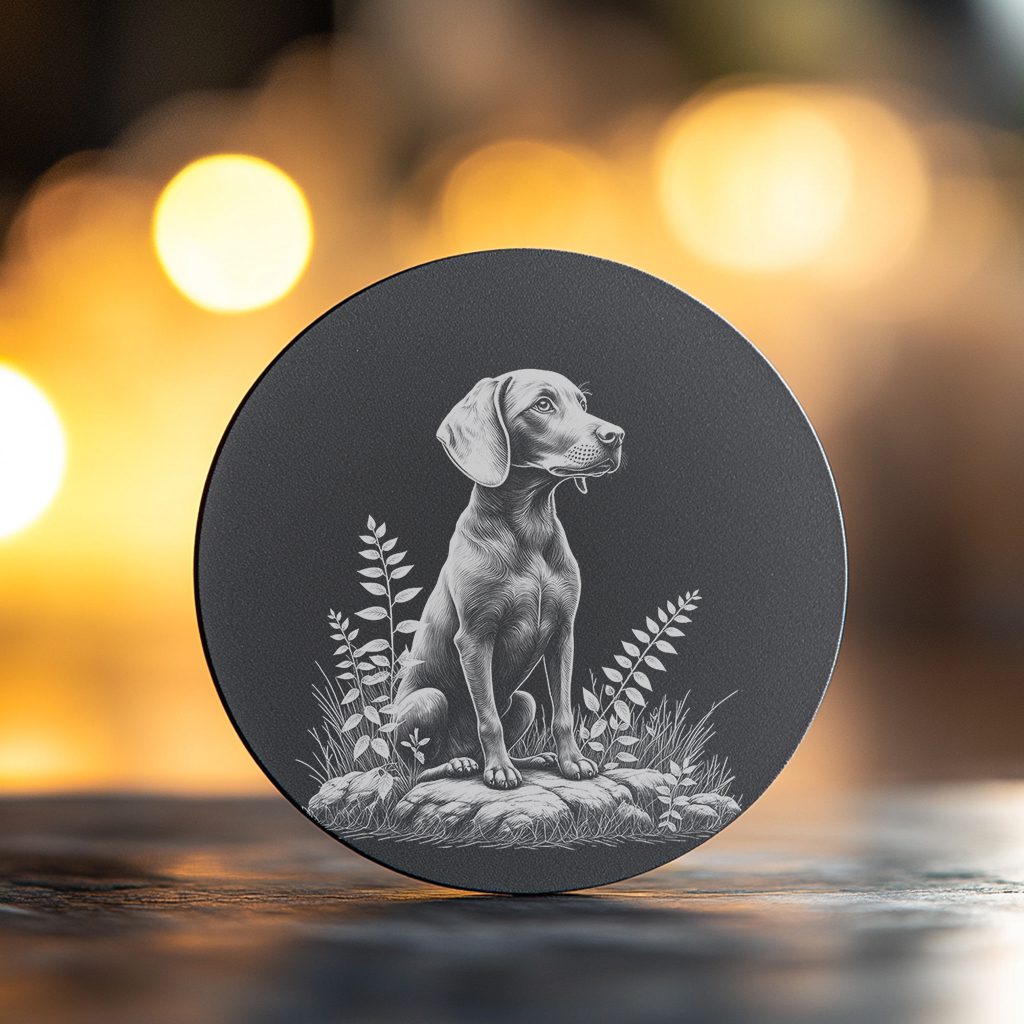 Bring a touch of rustic charm to your home decor with our Slate Coaster Laser Engraving File featuring a delightful dog sitting on rocks illustration. This digital PNG image is perfect for adding personality to any space.