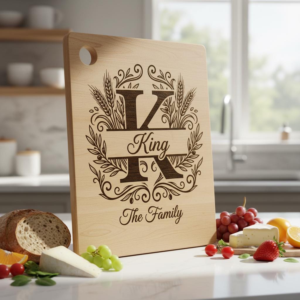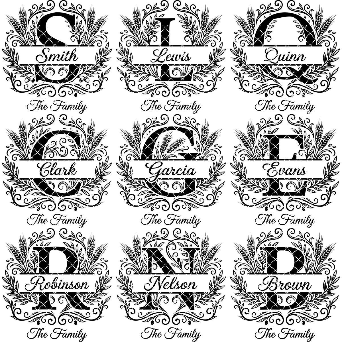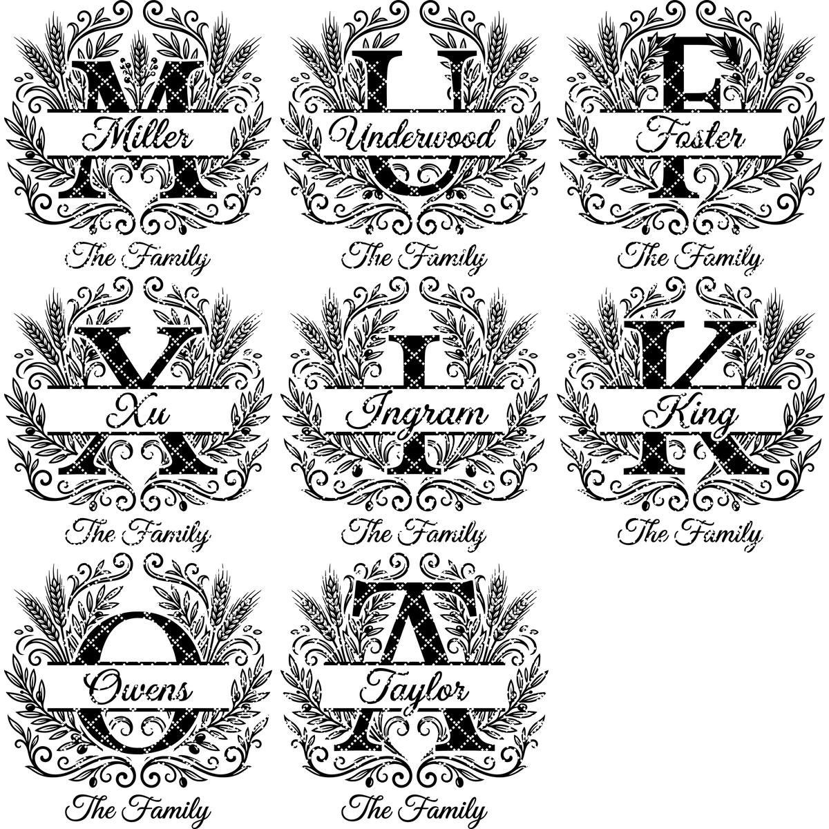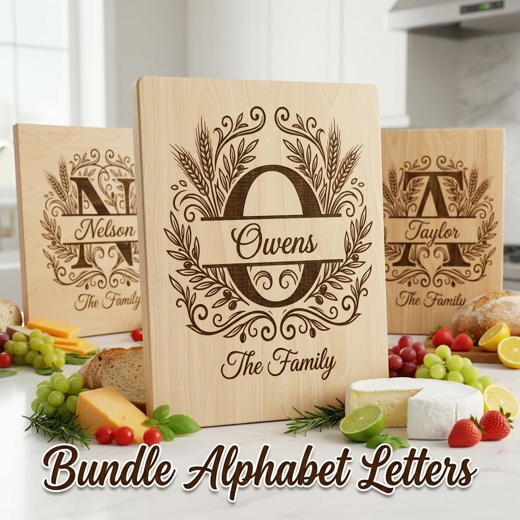 Transform your kitchen or gift projects with our unique engraving bundle, featuring a custom family name monogram surrounded by elegant harvest wheat and olive branch motifs. These graceful designs add a touch of rustic charm and sophistication to any setting.