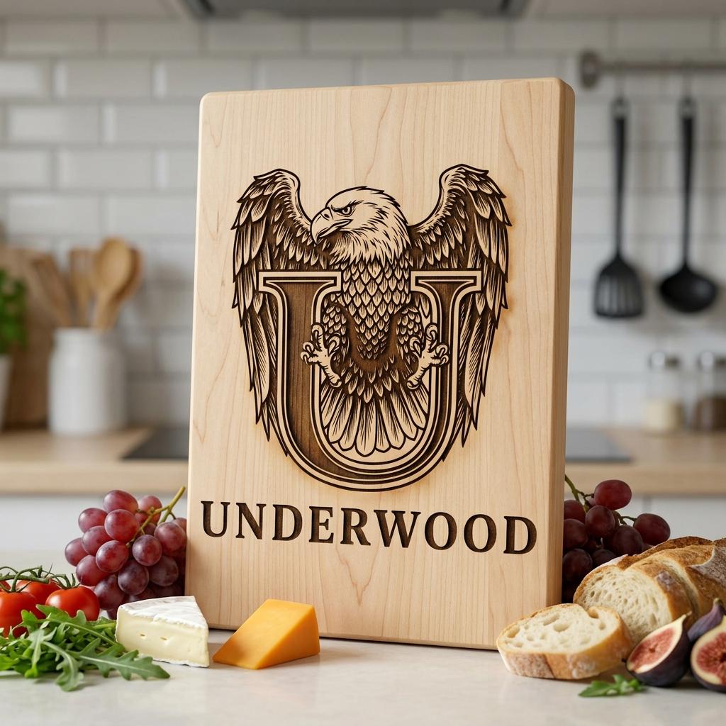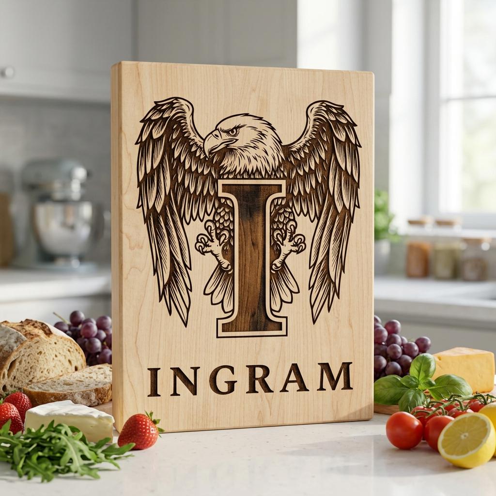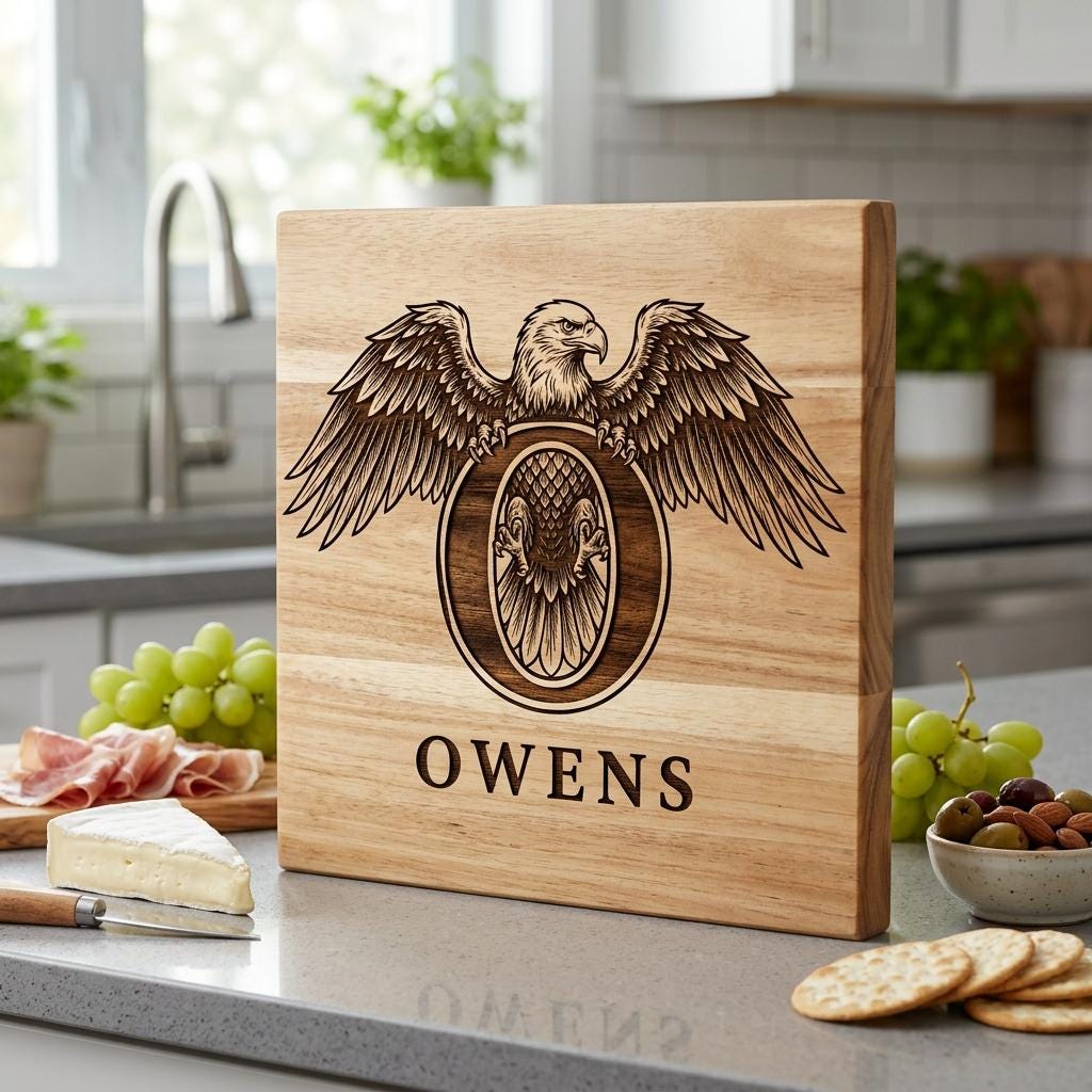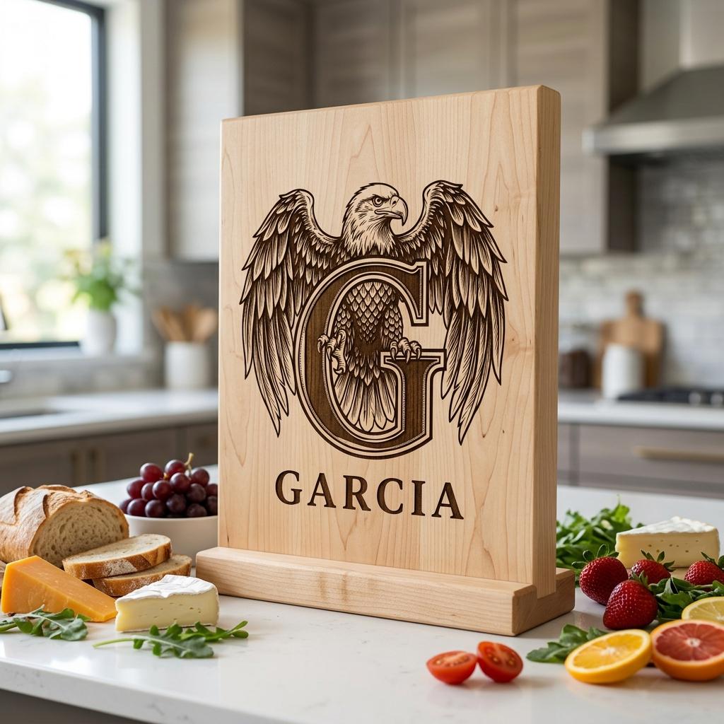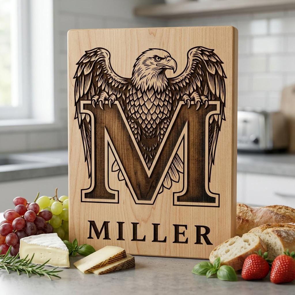 Create unforgettable gifts with a majestic eagle crest displaying your family initial at the center. Ideal for chopping boards, charcuterie displays, and kitchen decor, each monogram turns everyday entertaining into an impressive showcase of craftsmanship and pride.